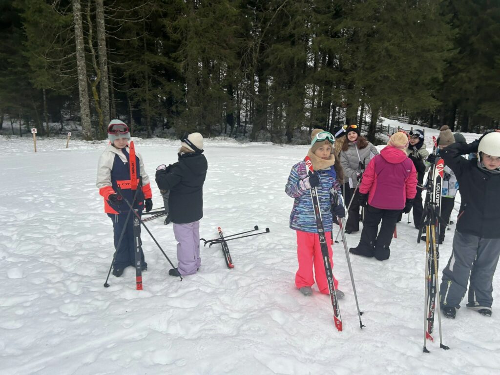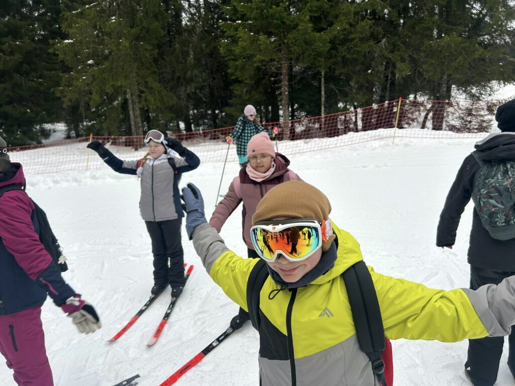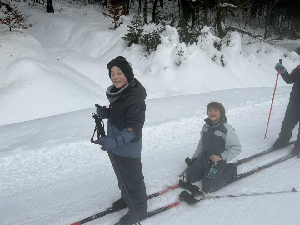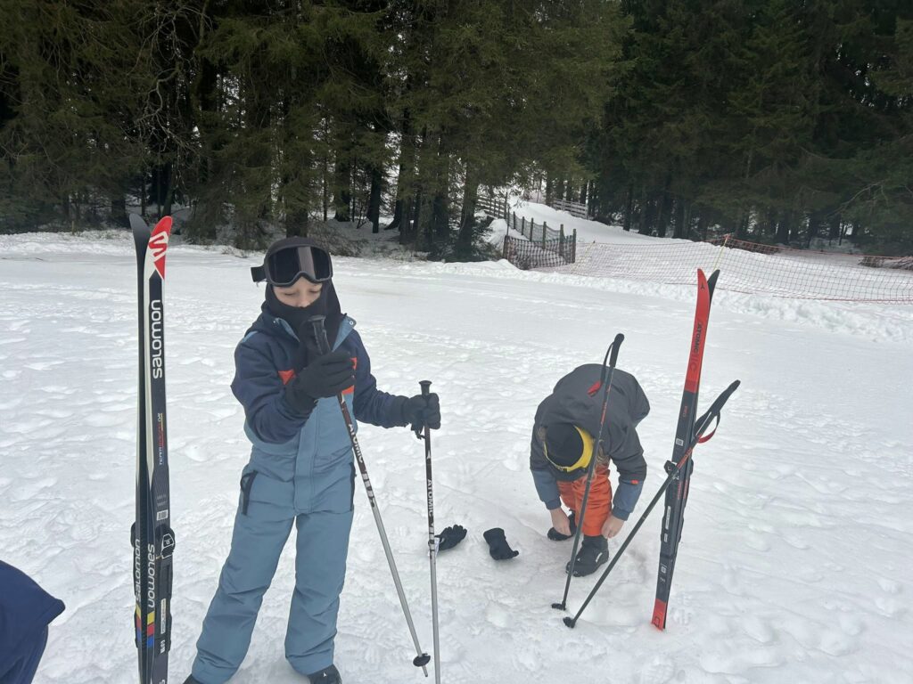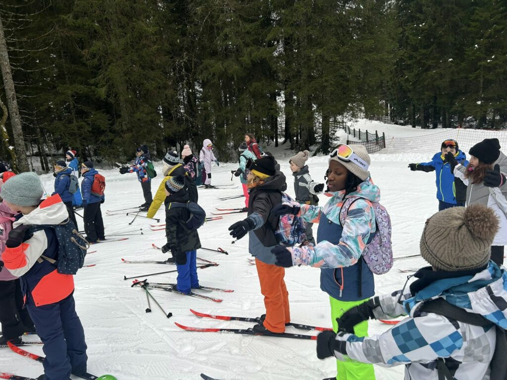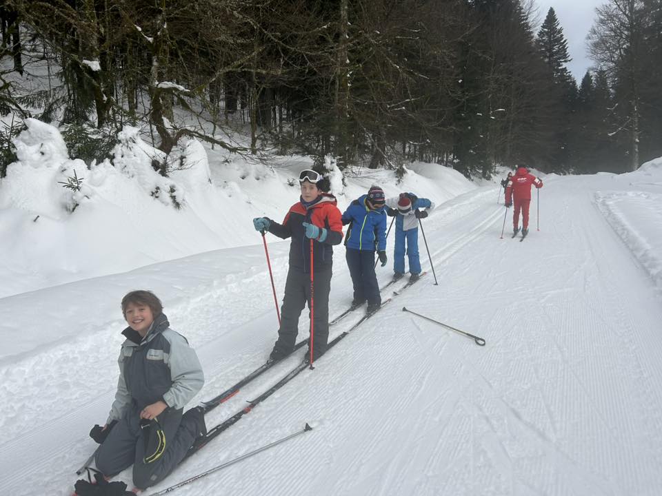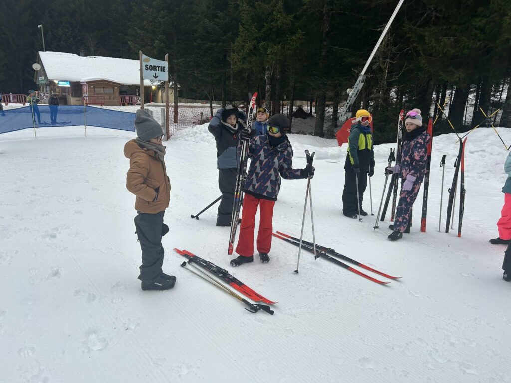 Ce matin, réveil avant 7h pour un petit déjeuner à 7h30, avant le départ vers les pistes de ski de fond. Pour beaucoup d’élèves, il s’agissait d’un tout premier contact avec les skis. Ils ont appris à chausser leurs skis, à tomber et surtout à se relever (une compétence qui s’est révélée très utile par la suite !), puis à effectuer leurs premières glisses. En fin de séance, les élèves ont découvert la technique du chasse-neige afin d’apprendre à s’arrêter en toute sécurité.