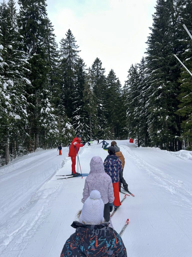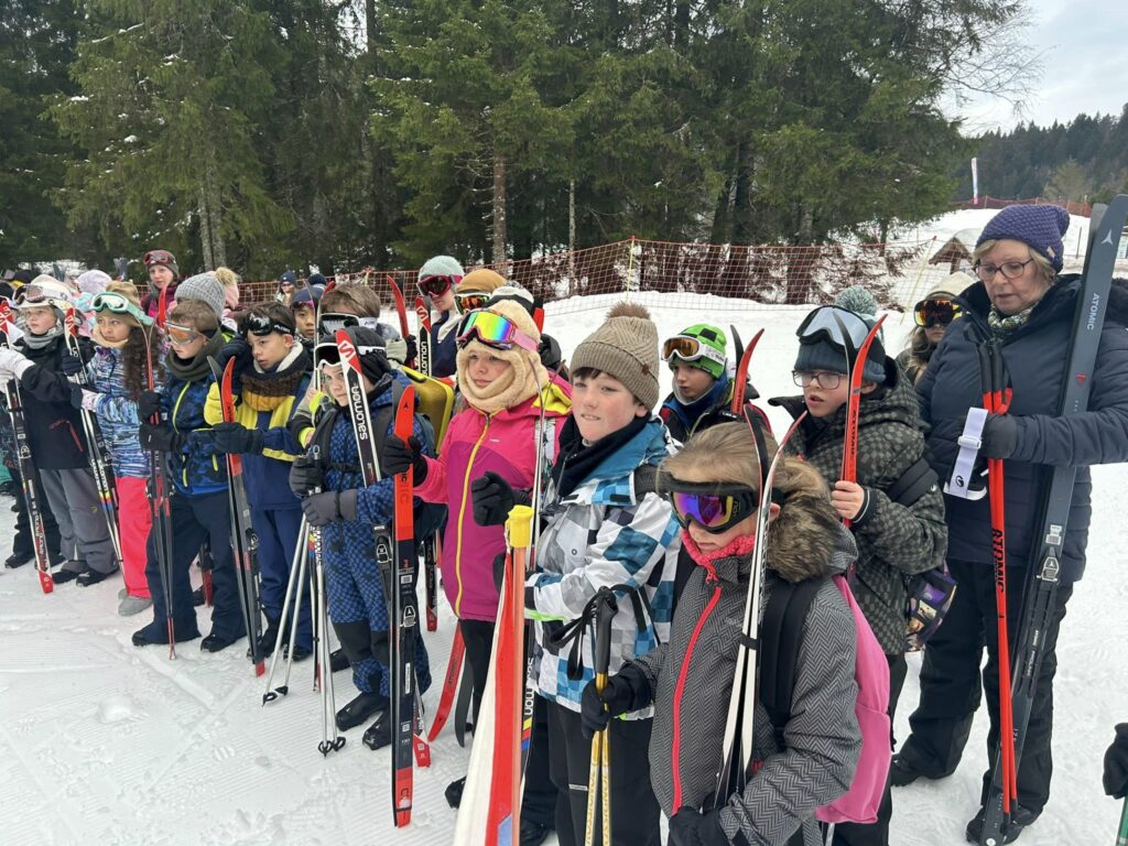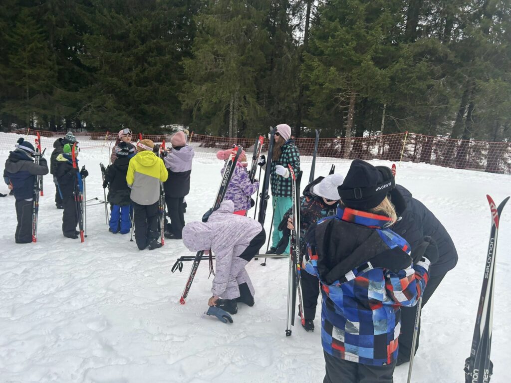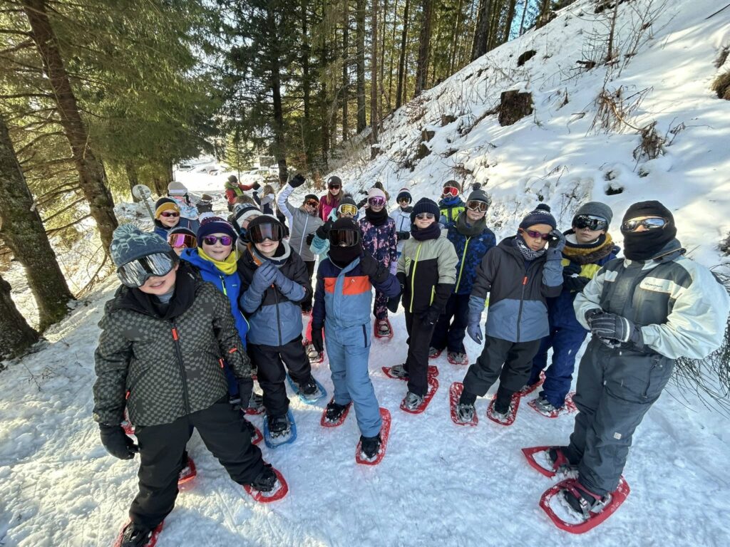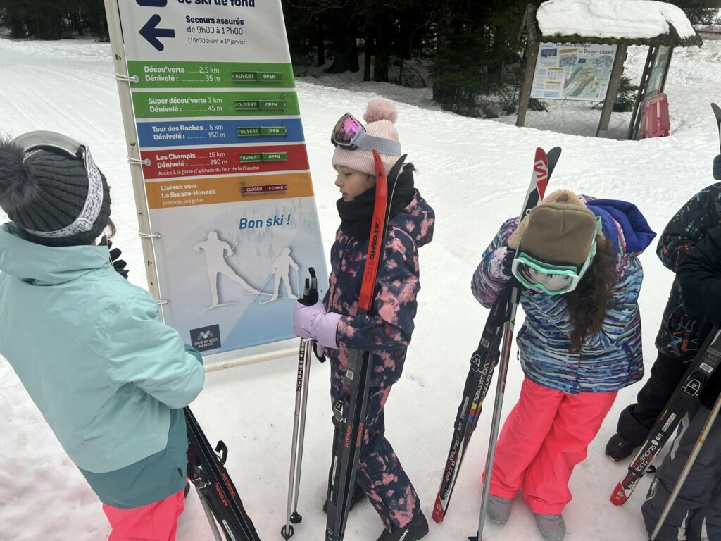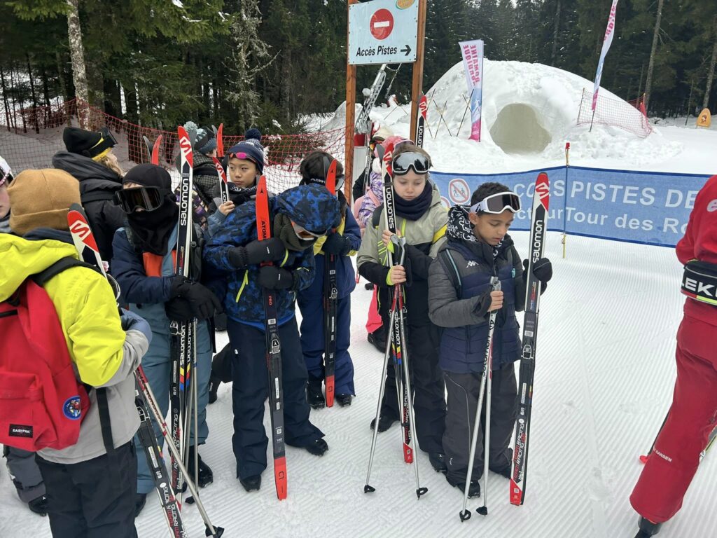 Ce matin, réveil avant 7h pour un petit déjeuner à 7h30, avant le départ vers les pistes de ski de fond. Pour beaucoup d’élèves, il s’agissait d’un tout premier contact avec les skis. Ils ont appris à chausser leurs skis, à tomber et surtout à se relever (une compétence qui s’est révélée très utile par la suite !), puis à effectuer leurs premières glisses. En fin de séance, les élèves ont découvert la technique du chasse-neige afin d’apprendre à s’arrêter en toute sécurité.