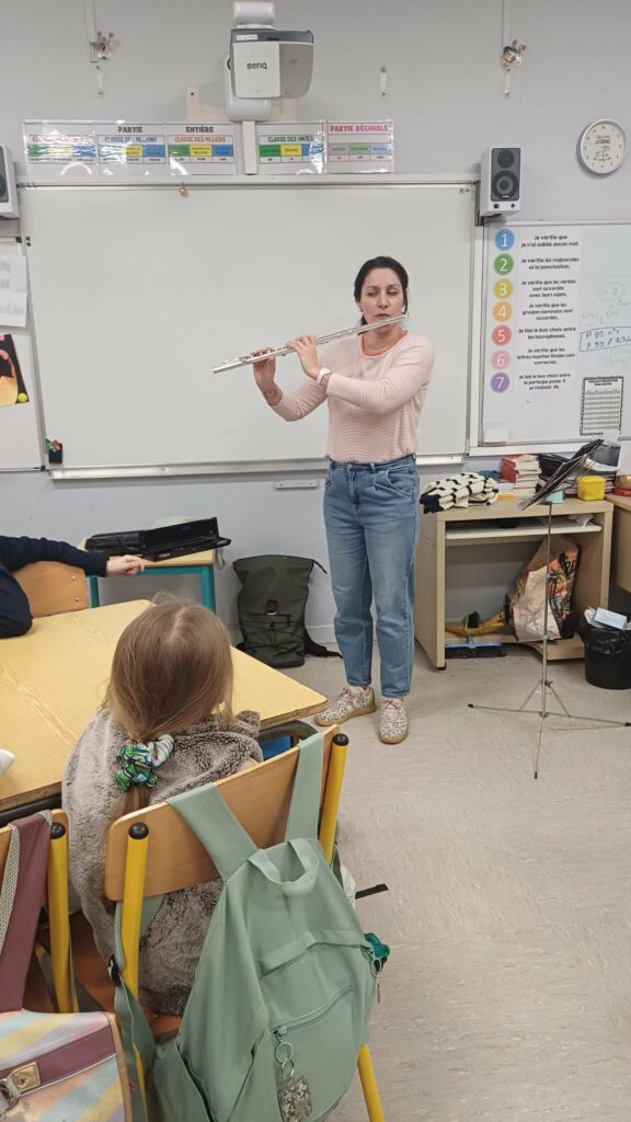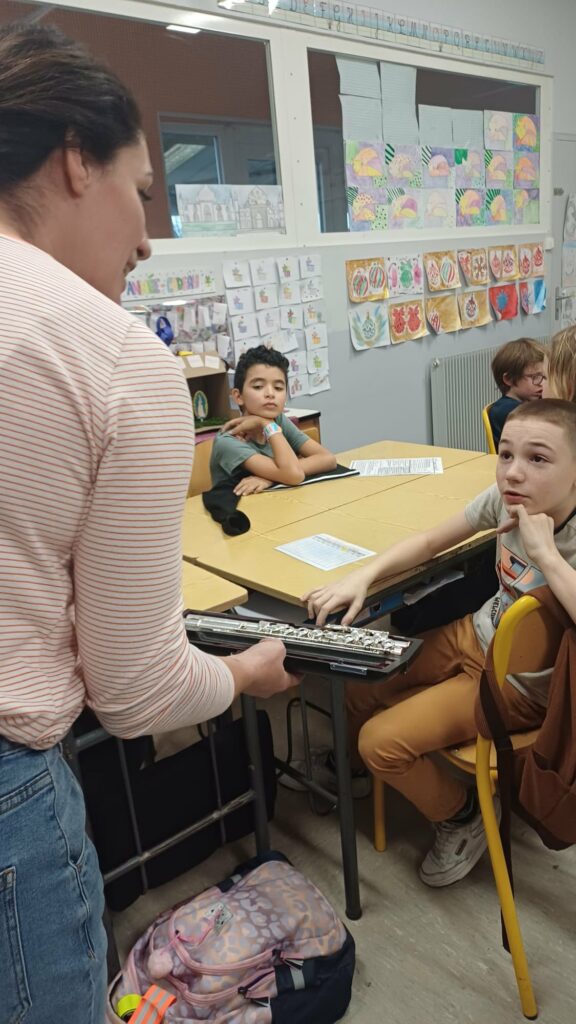 Les élèves de CM1-CM2 ont vécu un très beau moment de découverte musicale grâce à l’intervention d’Elena Cilli, professeure de flûte traversière au Conservatoire de Dunkerque.