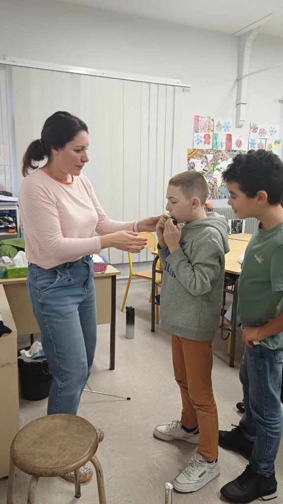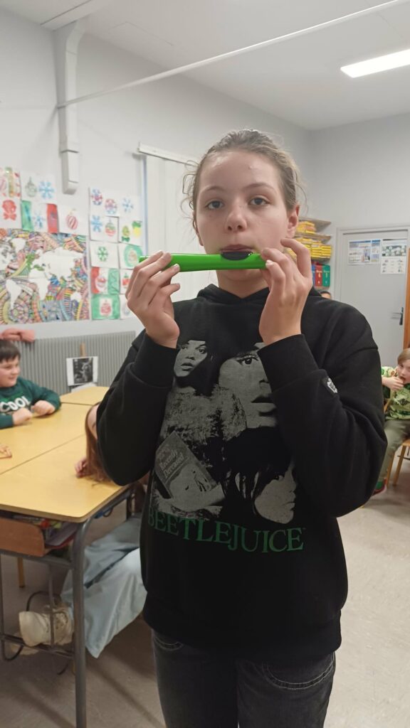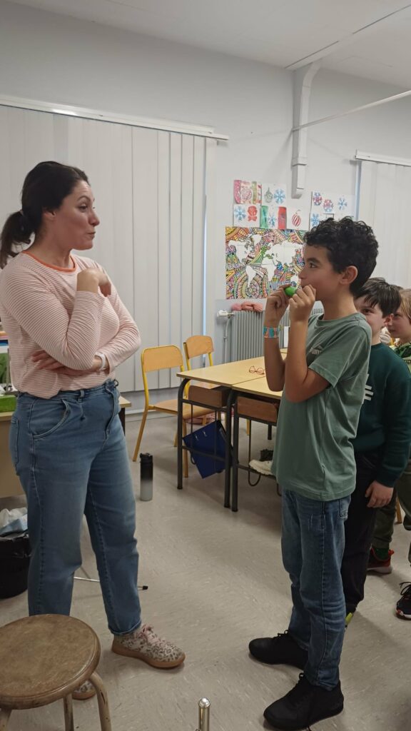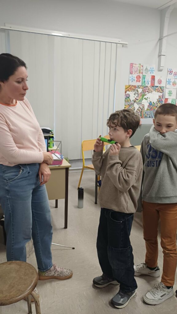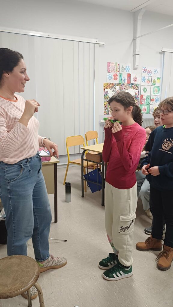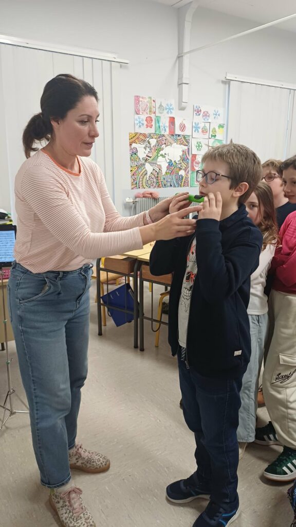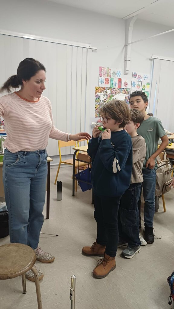 Les enfants ont également eu la chance d’assister à une petite prestation musicale, très appréciée, qui a permis de donner vie aux explications. Moment fort de la séance : les élèves ont ensuite pu essayer eux-mêmes de souffler dans les instruments, avec beaucoup de curiosité et d’enthousiasme !