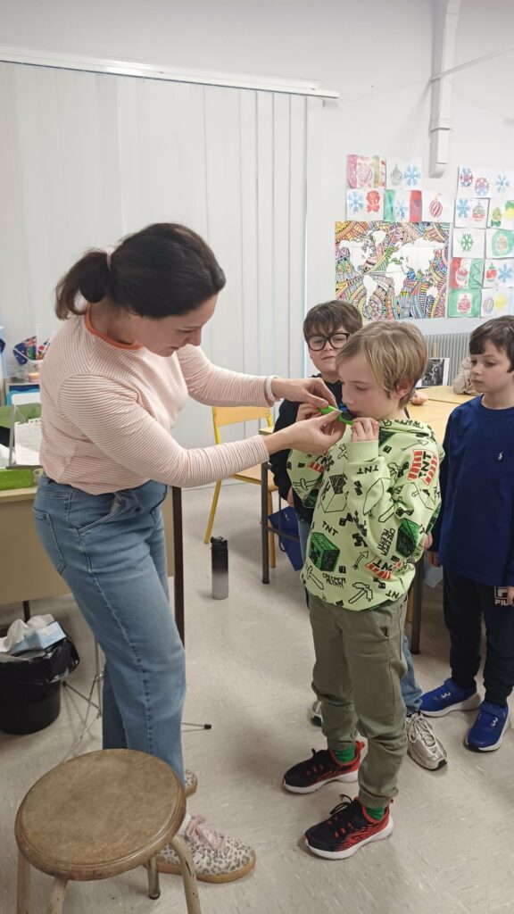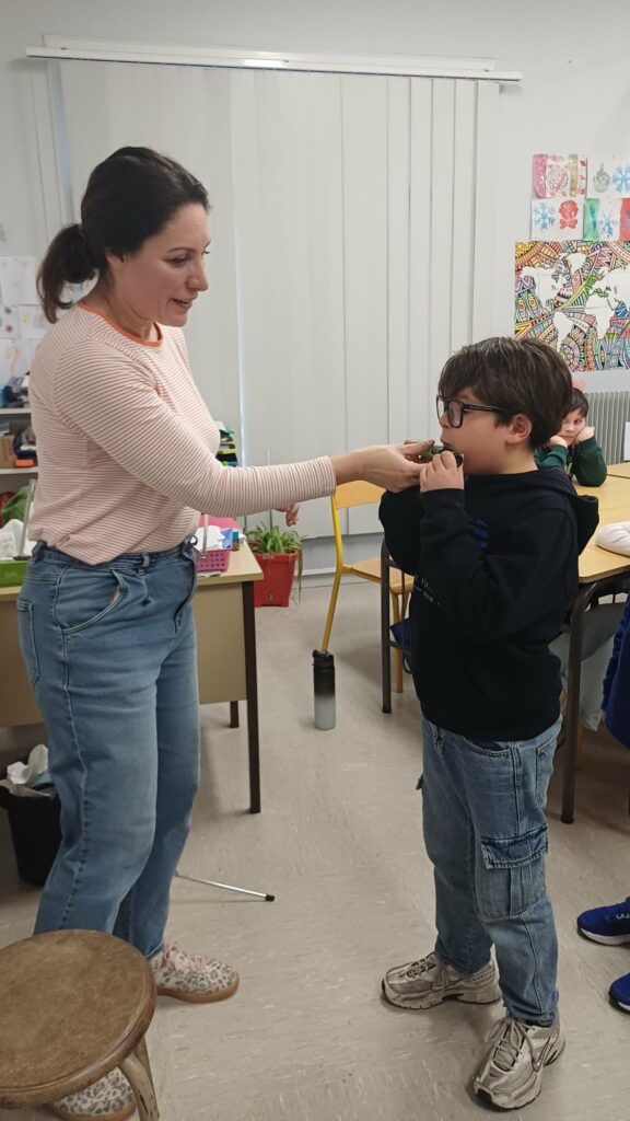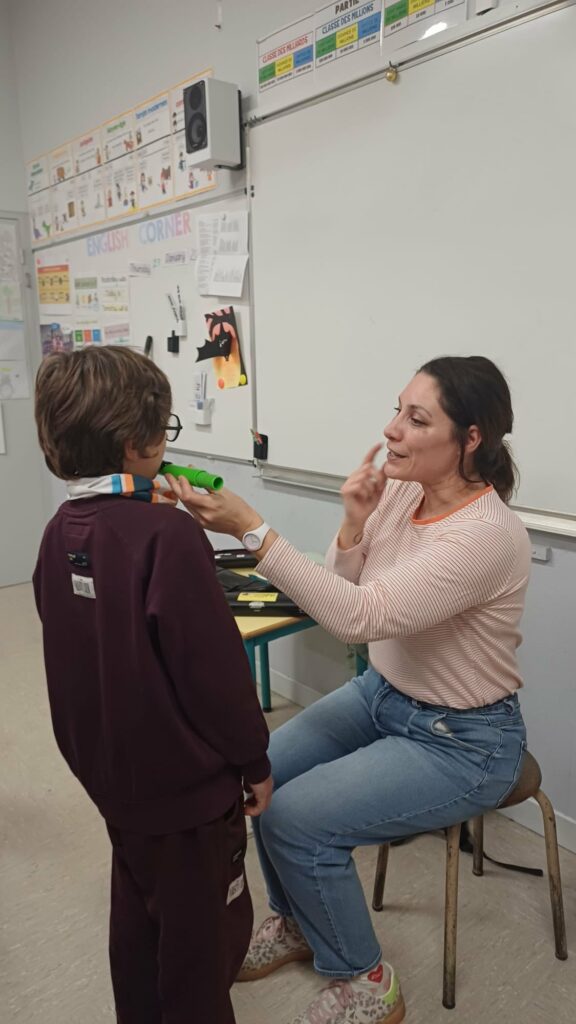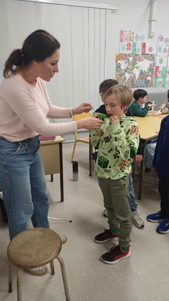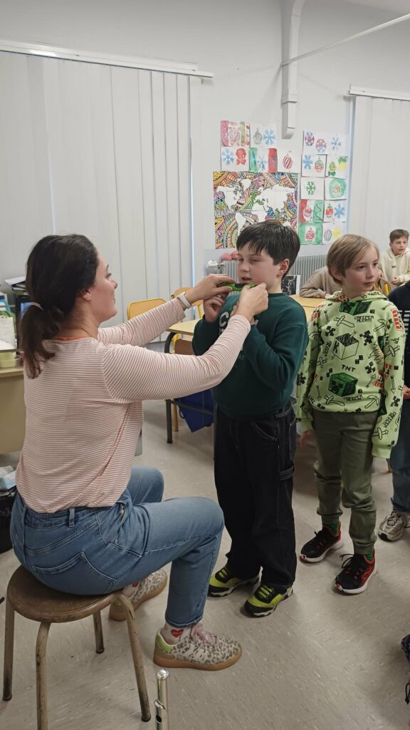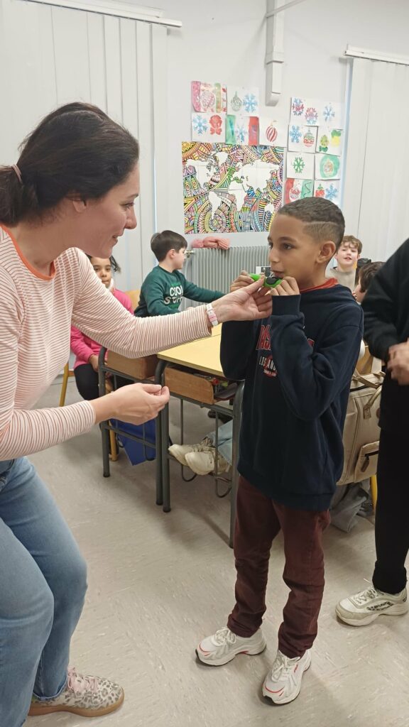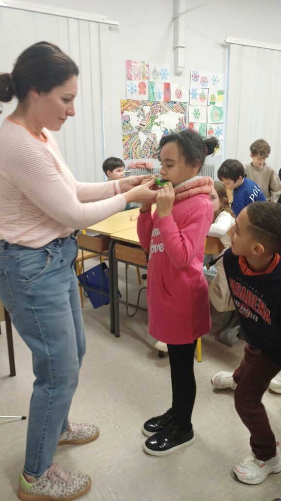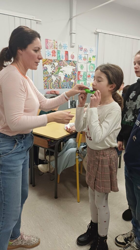Les enfants ont également eu la chance d’assister à une petite prestation musicale, très appréciée, qui a permis de donner vie aux explications. Moment fort de la séance : les élèves ont ensuite pu essayer eux-mêmes de souffler dans les instruments, avec beaucoup de curiosité et d’enthousiasme !