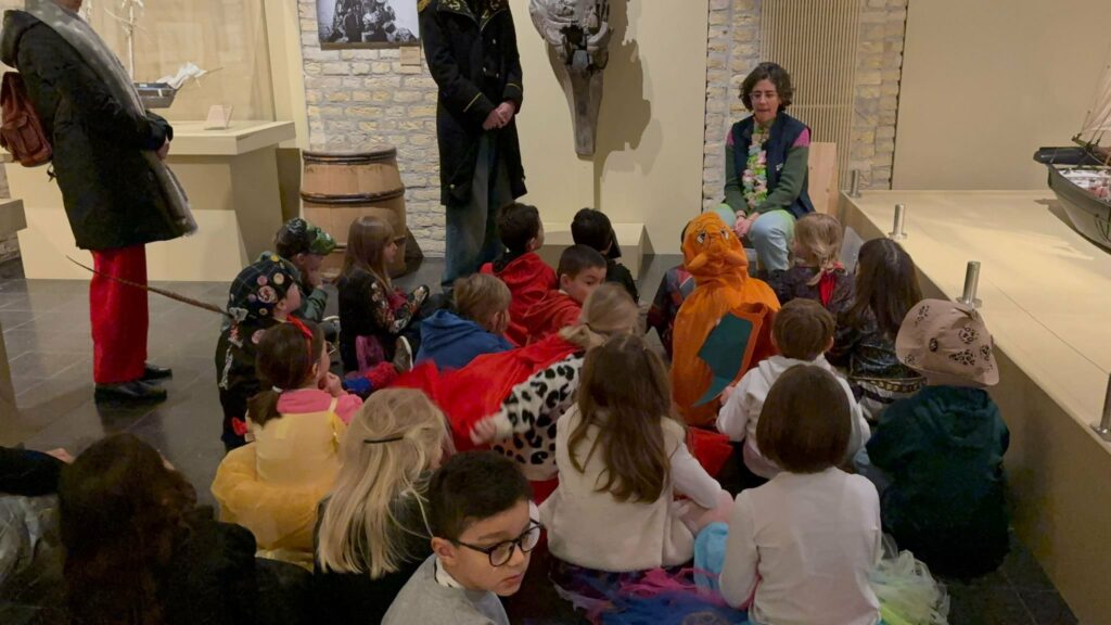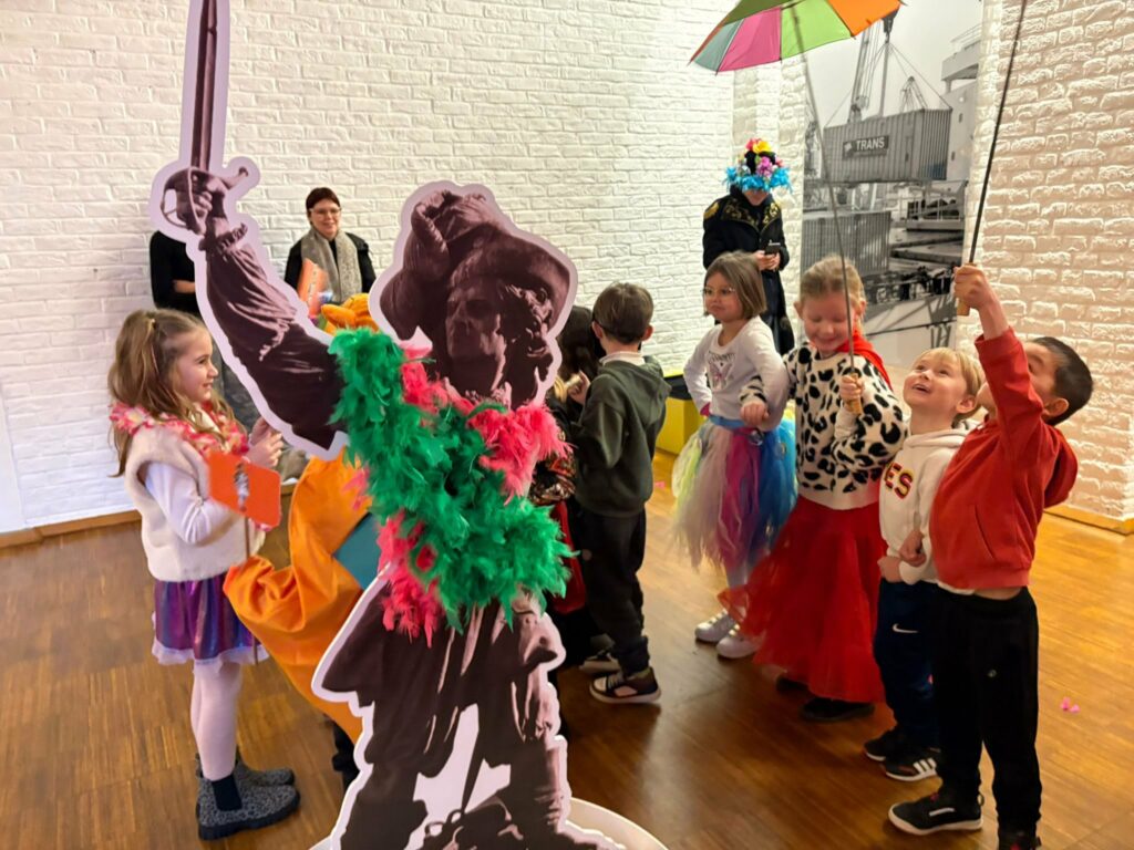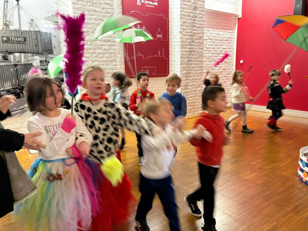 Les enfants ont découvert les origines du carnaval : le départ des pêcheurs en Islande, quelques chansons, l’histoire de Manotje et comment est formée la bande avec son tambour major, la cantinière et les musiciens.